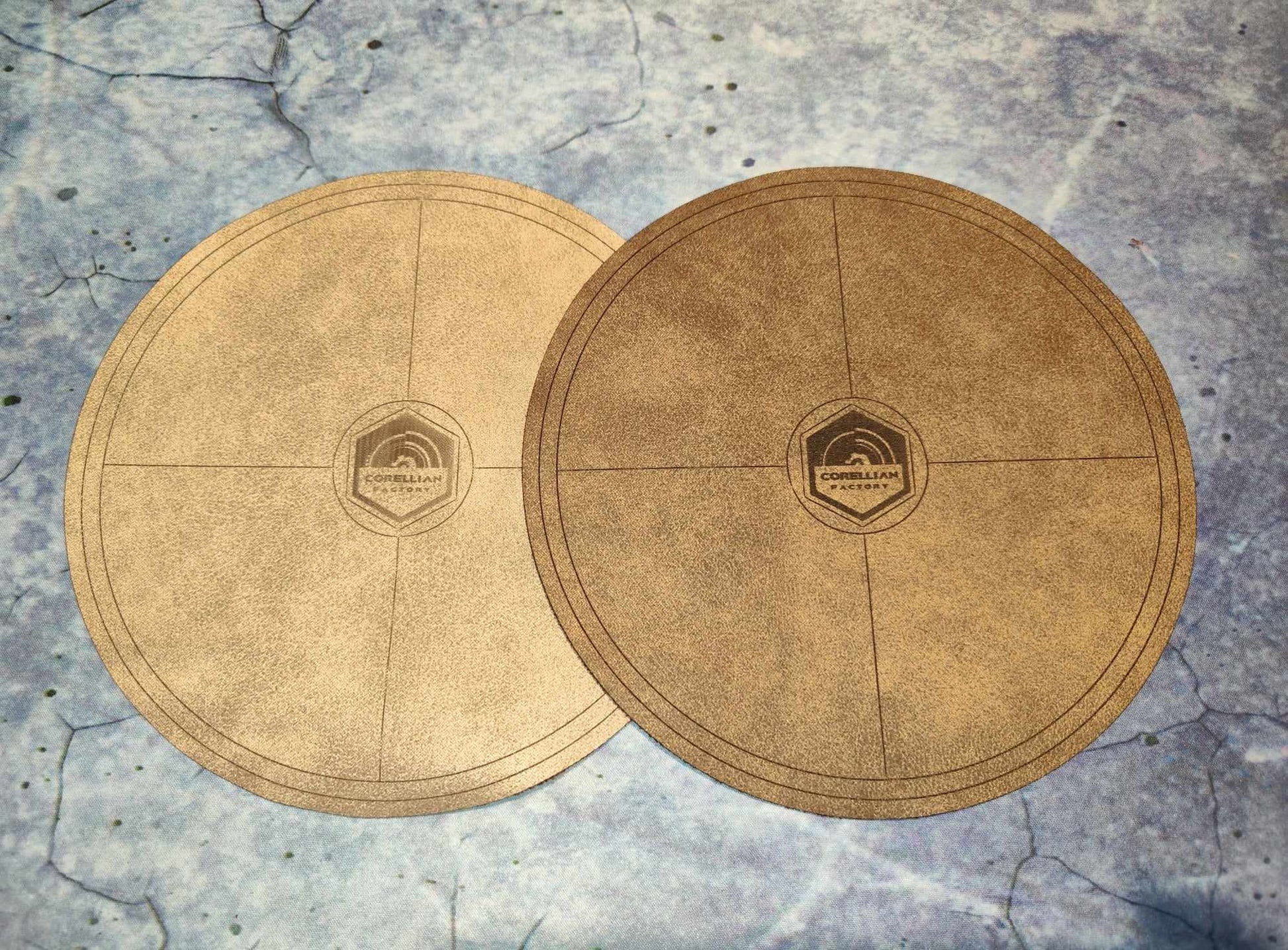 A set of 6 faux leather objective markers. No more debates about how many models are in range of an objective. If they're touching the marker, they're in range. These are great for measuring 3" from the edge of a 40mm objective marker, but still include a circle to measure from the center if needed.